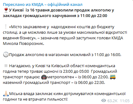 Как сообщалось, в столице и Киевской области комендантский час теперь начинается с 23:00 и длится до 05:00. Метрополитен работает с 06:00 до 22:00, а наземный общественный транспорт - с 06:00 до 22:00.