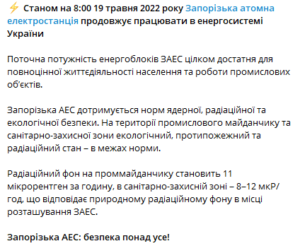 Сегодня утром компания сообщила, что станция продолжает работать в энергосистеме Украины. И обеспечивает энергией промышленные объекты.