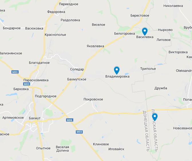 Эти населенные пункты расположены на северо-восток от Бахмута и прилегают к стратегической трассе Лисичанск-Бахмут - единственной, которая соединяет область с внешним миром (на карте).