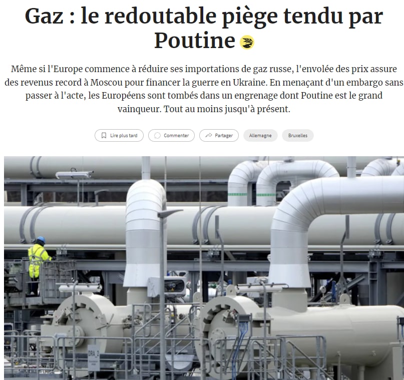 "Даже когда Европа начинает сокращать российский импорт газа, резкий рост цен обеспечивает рекордные доходы Москвы. Пригрозив эмбарго без действий, европейцы попали в ловушку, главным победителем которой является Путин", - делает вывод издание.
