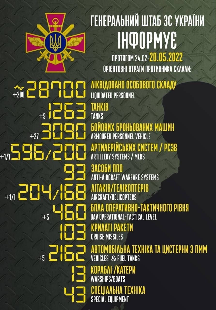 09:31 Актуальные данные по потерям противника на 20 мая (по версии Генштаба ВСУ).