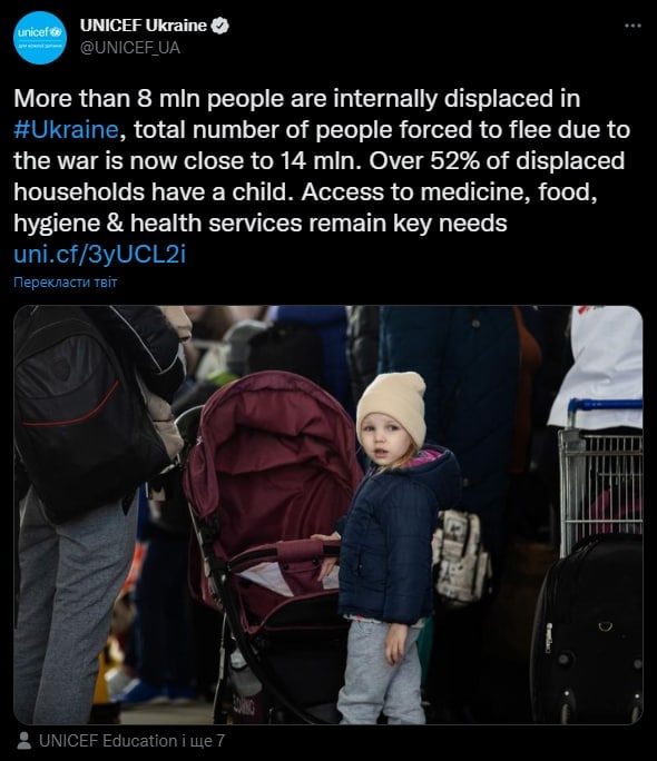 Общее число бежавших от войны приближается к 14 миллионам, сообщают в UNICEF.