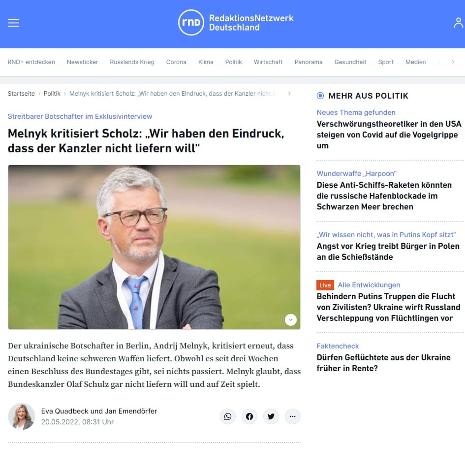 "Cкладывается впечатление, что канцлер не хочет поставлять" тяжелое вооружение Украине", - сказал Мельник.