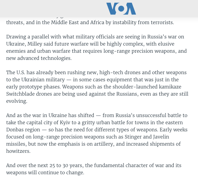 Председатель Объединенного комитета начальников штабов США Марк Милли заявил, что войны будущего будут иметь преимущественно городской характер, как сейчас в Украине, с применением роботизированной военной техники и искусственного интеллекта.