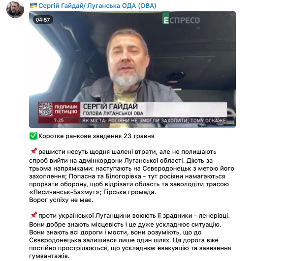 Также он подтвердил, что после подрыва моста между Северодонецком и Лисичанском, остался один проезд между городами, он простреливается. И хотя это "очень рискованно, но по нему вывозят людей и подвозят грузы".