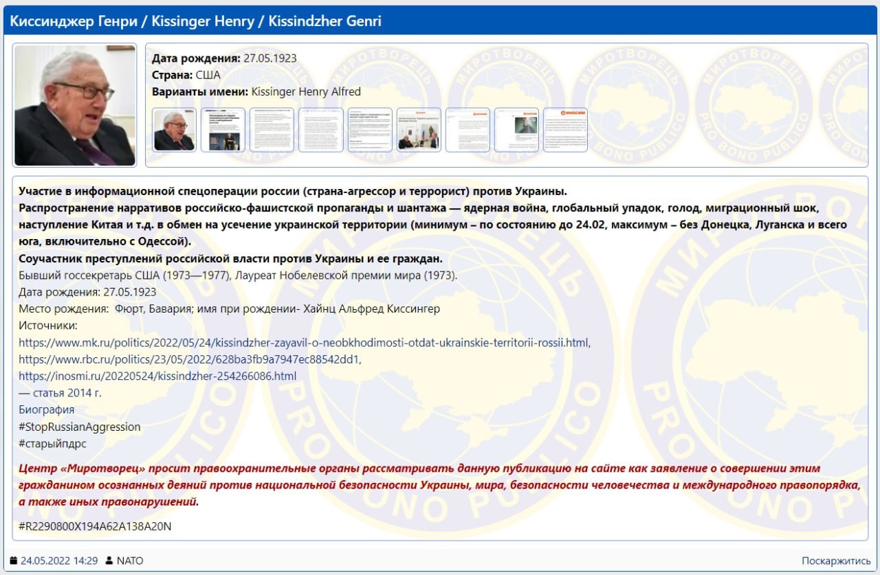 Кстати, Киссинджера внесли на "Миротворец" в день его рождения. Как раз сегодня экс-госсекретарю США исполнилось 99 лет.