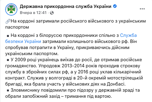 Украинские пограничники и сотрудники СБУ задержали бывшего военного РФ при попытке въехать в Украину из Беларуси. Мужчина родился в Украине и у него остался украинский паспорт, хотя он стал гражданином и солдатом РФ.