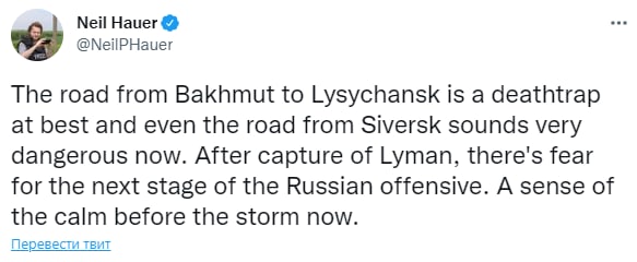 "После захвата Лимана есть опасения, что будет следующий этап наступления русских. Ощущение затишья перед бурей", - пишет журналист.