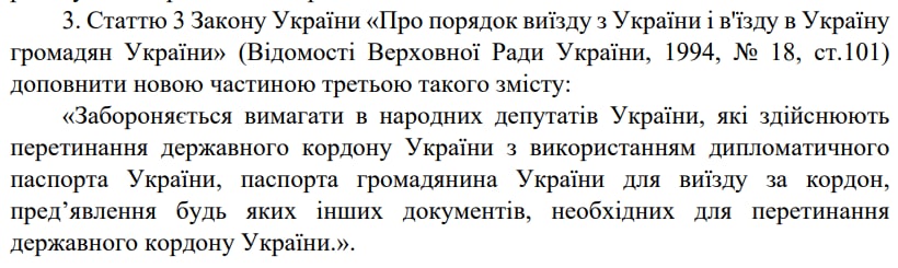 В законопроекте №7383 предлагается убрать эту норму. И запретить пограничникам требовать у нардепов что-либо кроме паспорта - обычного или дипломатического.