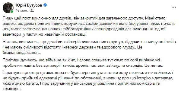 Началось все со вчерашнего вечернего поста Бутусова. В нем он обещал опубликовать детали "авантюры" руководителей силовых структур, которые подверглись влиянию политиков" и "начали нецелевое применение украинских боеспособных спецподразделений для выполнения одной авантюры в тактически невыгодной обстановке".