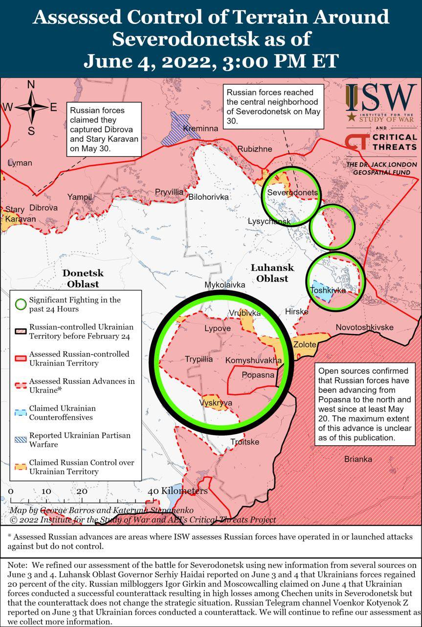 Украинские силы провели успешные локальные контратаки в Северодонецке, а прогресс российских войск в прямых штурмах города и более широких операциях по его окружению остается медленным.