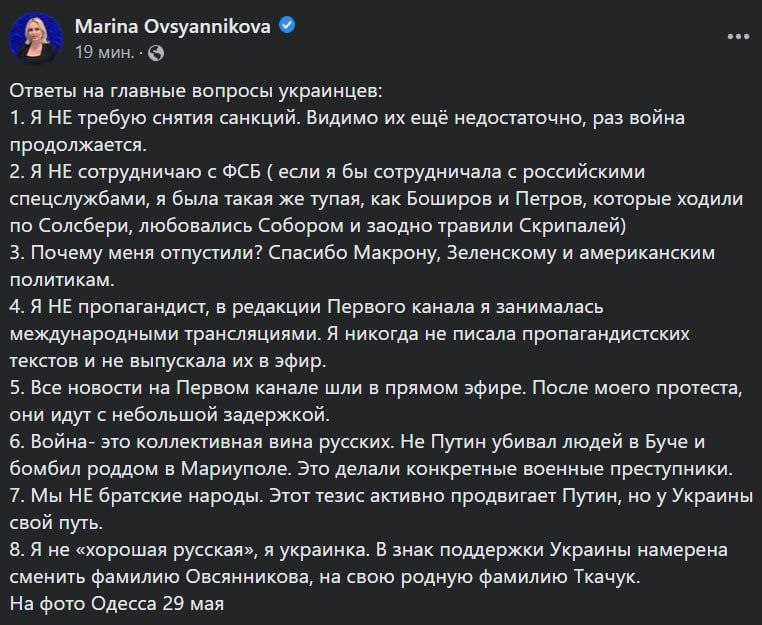 Овсянникова заявила, что "война - это коллективная вина русских", в то же время отметила, что убивал людей в Буче и бомбил Мариуполь не Путин, а "конкретные военные преступники".