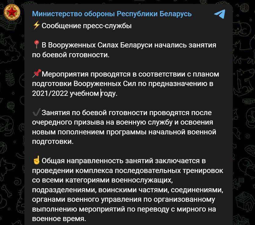 11.40 В Вооруженных Силах Беларуси начались занятия по переходу с мирного на военное время. Там проводят комплекс тренировок со всеми категориями военнослужащих, подразделениями, воинскими частями, - сообщает Минобороны Беларуси.