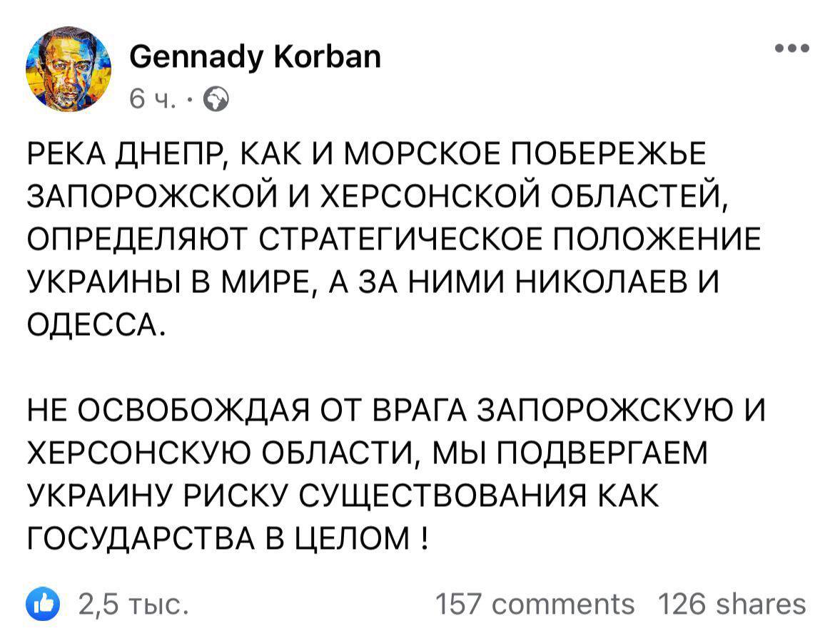 Река Днепр, впадающая в море, имеет стратегическое значение для страны, такое же как и морское побережье Запорожской и Херсонской областей. И это не только зерно и сельское хозяйство. Это порты, пресная вода. Если перекрыть аорту к сердцу, образуется тромб. Потеря реки может привести к клиническим последствиям для страны, поэтому нам нужно развивать контрнаступление по этим фронтам", - сказал Корбан "Стране", объяснив использованный при написании поста капслок желанием быть услышанным.