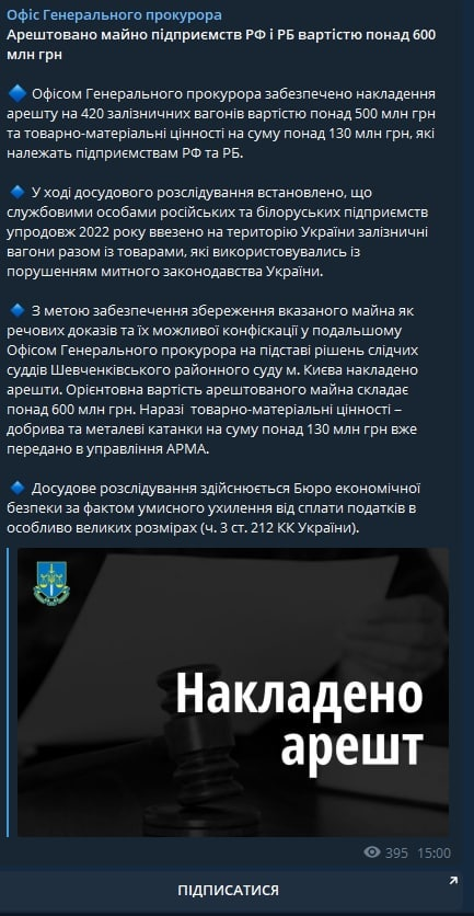 Генеральная прокуратура арестовала 420 российских и белорусских вагонов на 500 млн гривен. При этом  товаров в них было на 130 миллионов гривен.