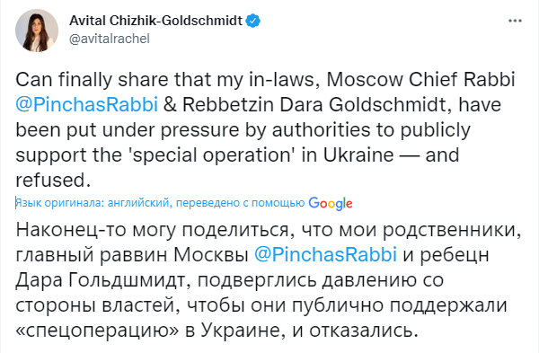 "Теперь наконец я могу сообщить, что мои свекор и свекровь, главный раввин Москвы Пинхас Гольдшмидт и ребецн Дара Гольдшмидт подверглись давлению со стороны властей, которые требовали, чтобы они публично поддержали "спецоперацию" в Украине, но они отказались", - написала Чижик-Гольдшмидт в Тwitter.