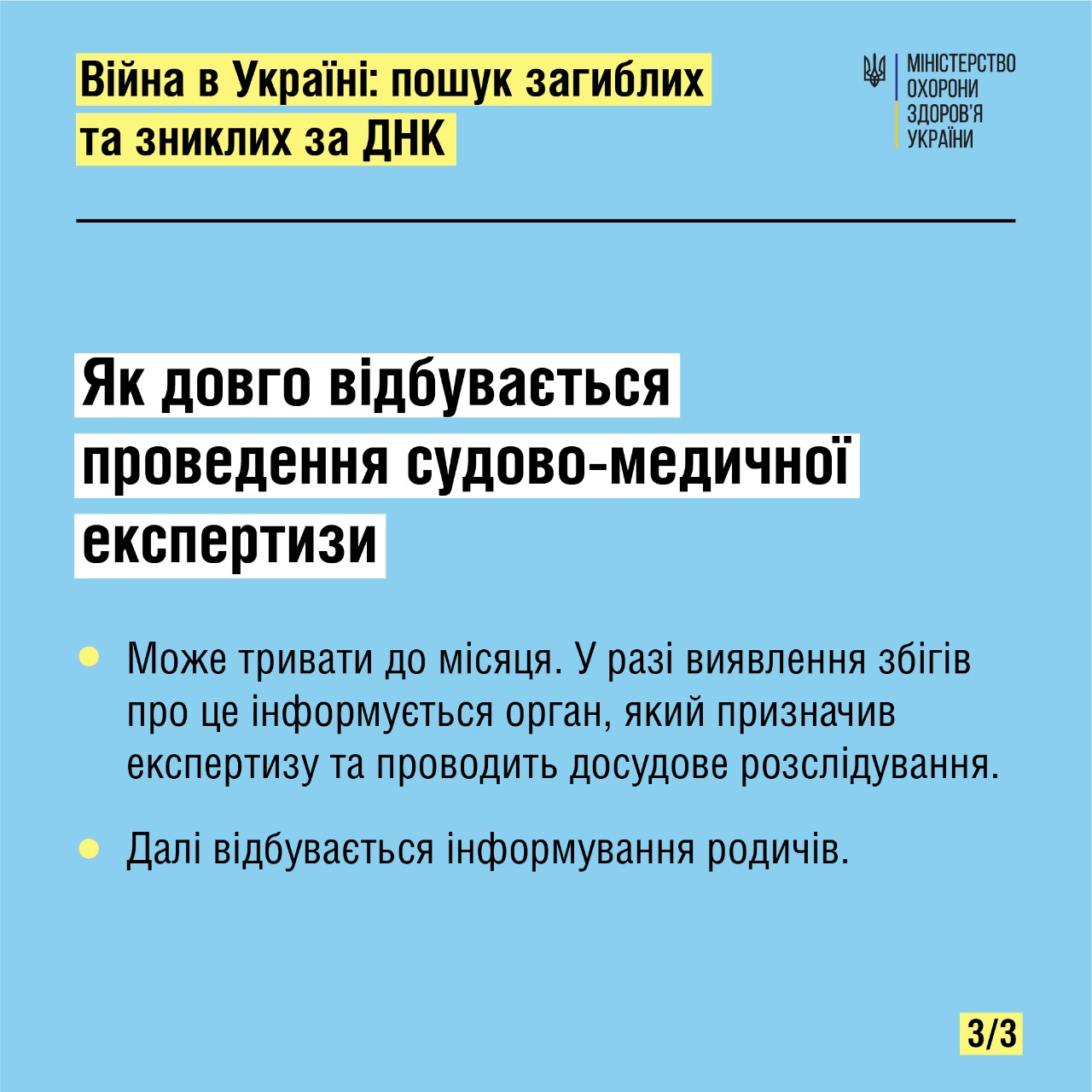 • ДНК-карта направляется в Государственный научно-исследовательский экспертно-криминалистический центр МВД Украины. Там ее добавляют в базу централизованного учета генетических признаков человека под уникальным идентификатором. Его присваивают и при регистрации неустановленных лиц. После этого устанавливаются генетические признаки родственников погибших, пропавших и неопознанных лиц. Для этого в каждом управлении полиции уже созданы рабочие группы, принимающие заявления.