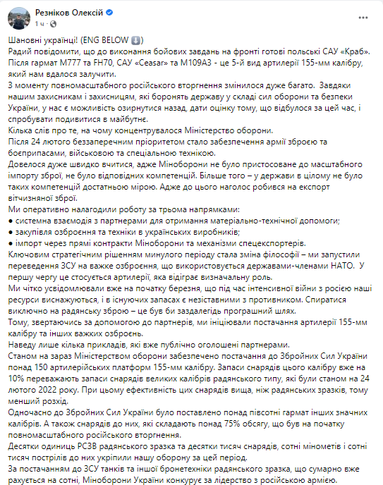 Также Резников сообщил, что польские САУ "Краб" 155-калибра уже находятся на фронте. Также по его мнению,  оружия, которое уже поступило Украине, хватило бы для победного сопротивления от любой армии Европы, но не от России.