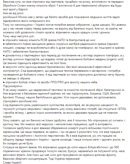• привлечь сотни единиц тяжелой бронетехники, без которой невозможно эффективное контрнаступление. Следует учитывать, что советская техника преимущественно является устаревшей и требует приведения в боевое состояние. А от партнеров мы пока получаем достаточно легкую броню, не всегда с оружием.