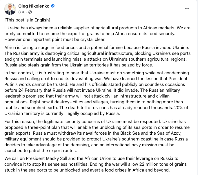 "Африке грозит скачок цен на продовольствие и потенциальный голод из-за вторжения России в Украину. В этом контексте неприятно слышать, что Украина должна что-то делать - без осуждения России и призывов к ней прекратить разрушительную войну", - заявил Николенко.
