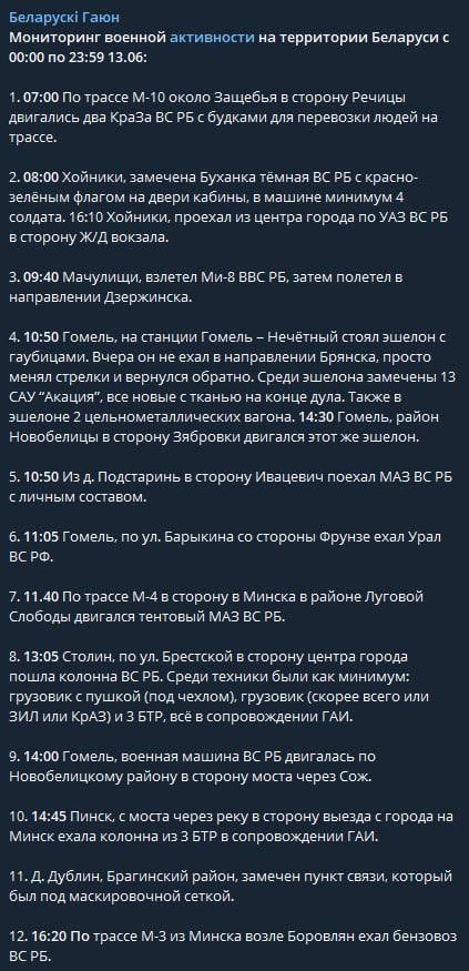 "На станции Гомель - Нечетный стоял эшелон с гаубицами. Вчера он не ехал в направлении Брянска, просто менял стрелки и вернулся обратно. Среди эшелона замечены 13 САУ "Акация", все новые с тканью на конце дула. Также в эшелоне 2 цельнометаллических вагона. 14:30 Гомель, район Новобелицы в сторону Зябровки двигался этот же эшелон", - говорится в сообщении.