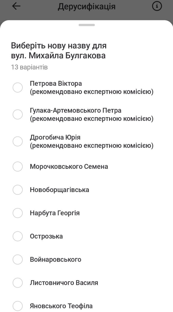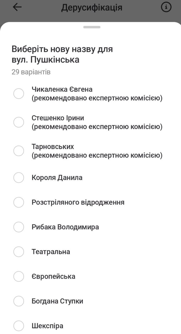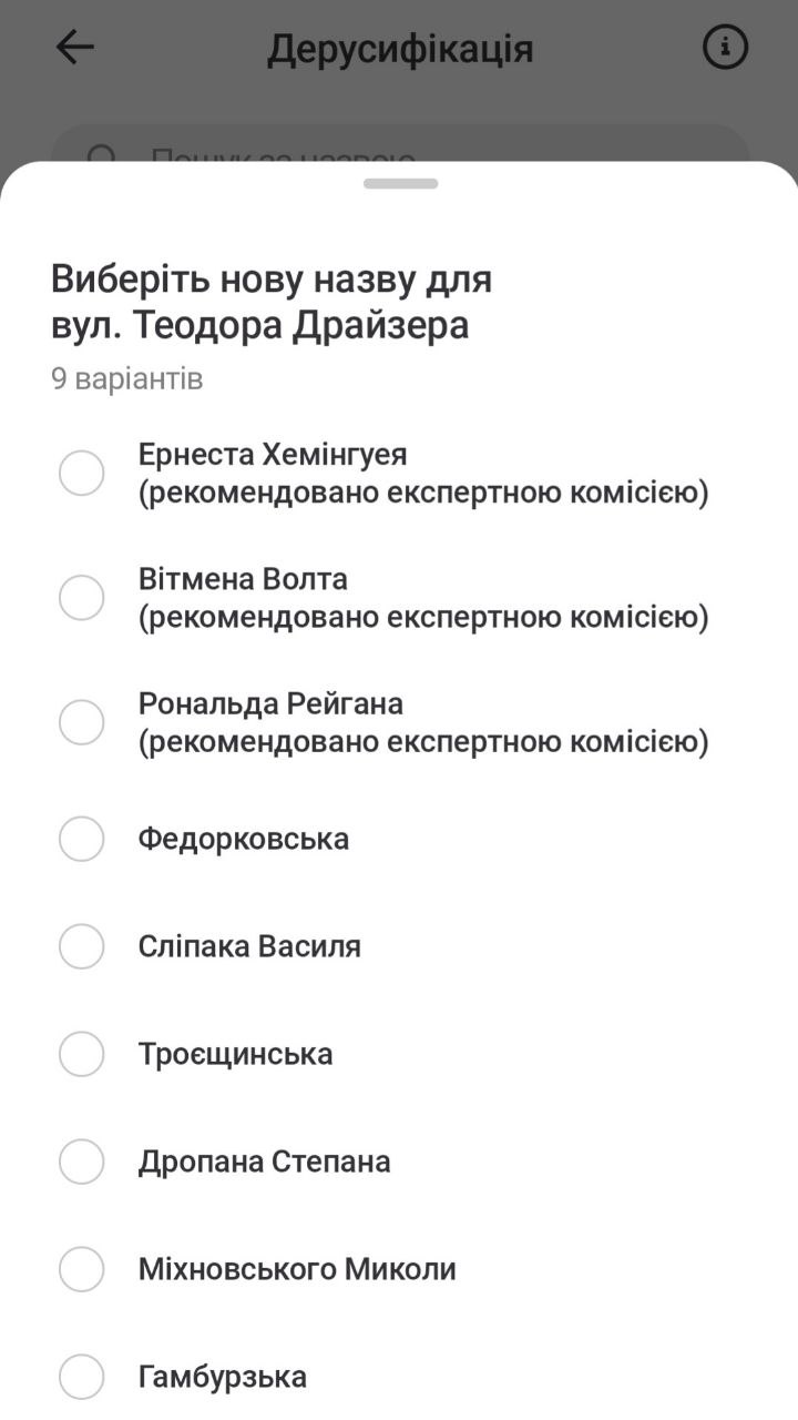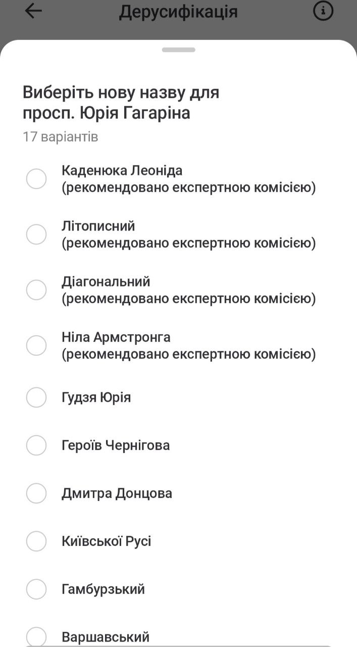 Всего в голосовании предложили 21 вариант вместо Маршала Малиновского. Среди них есть названия в честь американского генерала Дуайта Эйзенхауэра, украинского анархиста Нестора Махно, казака Самийла Кишки.
