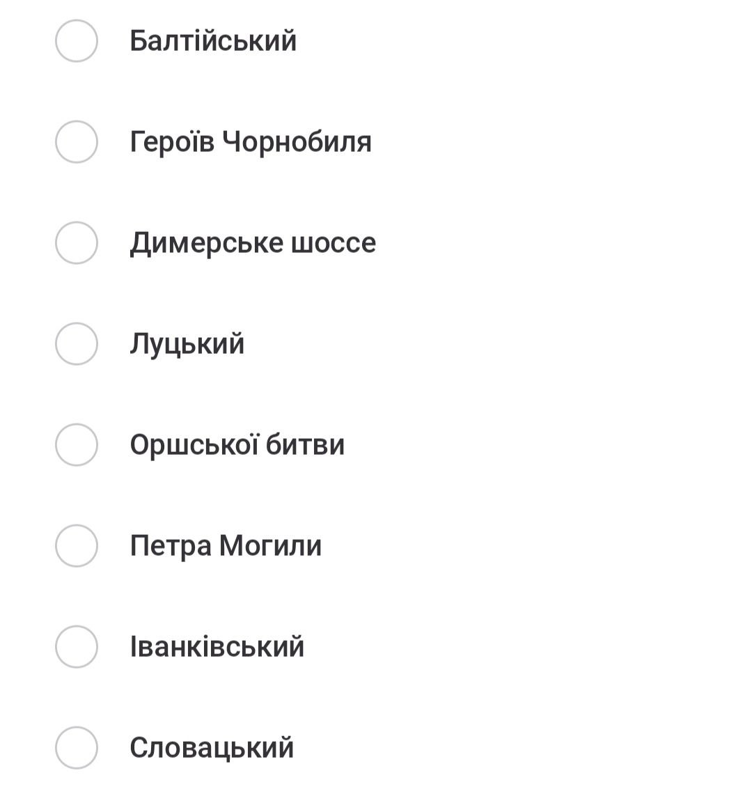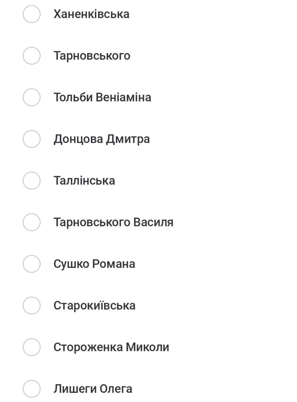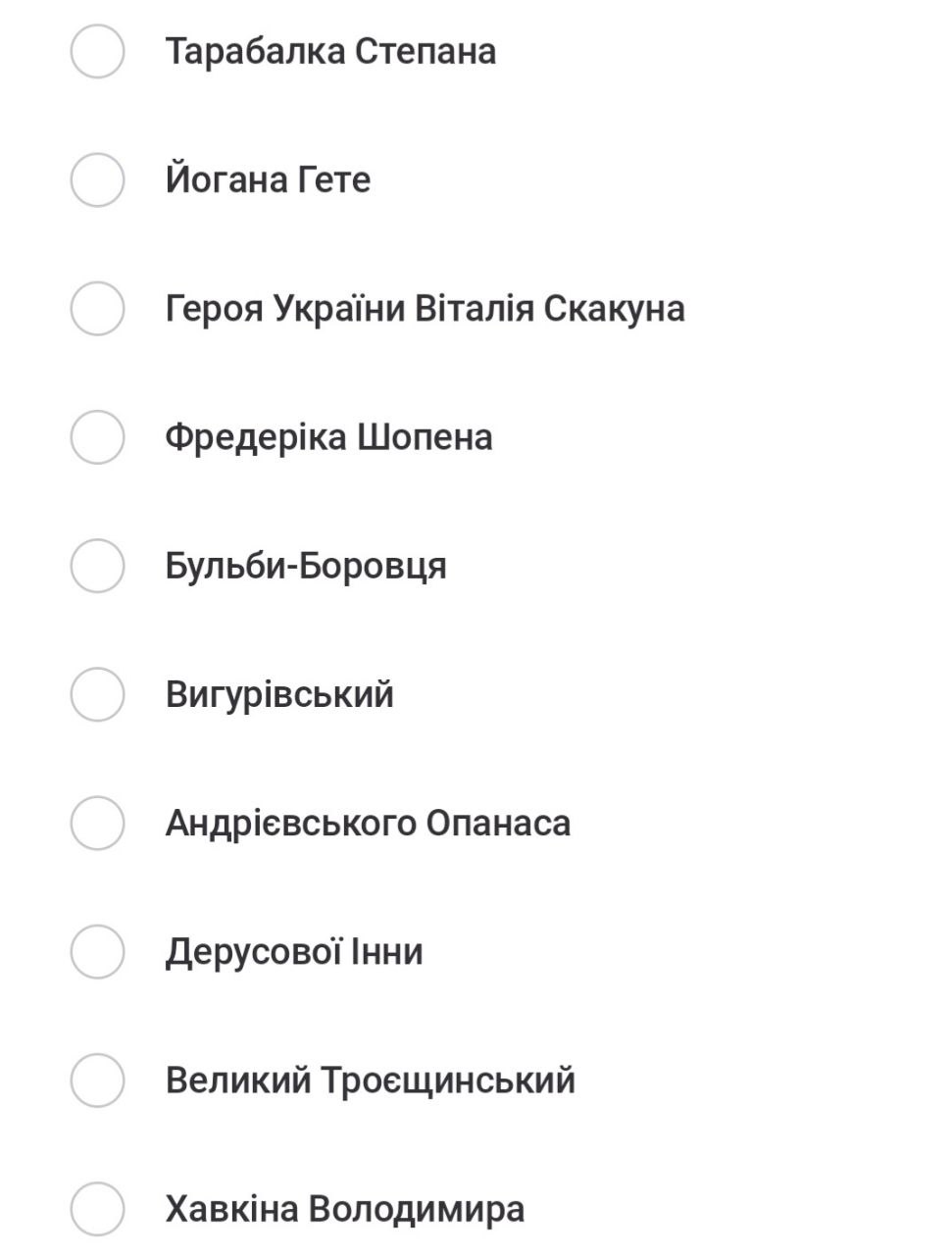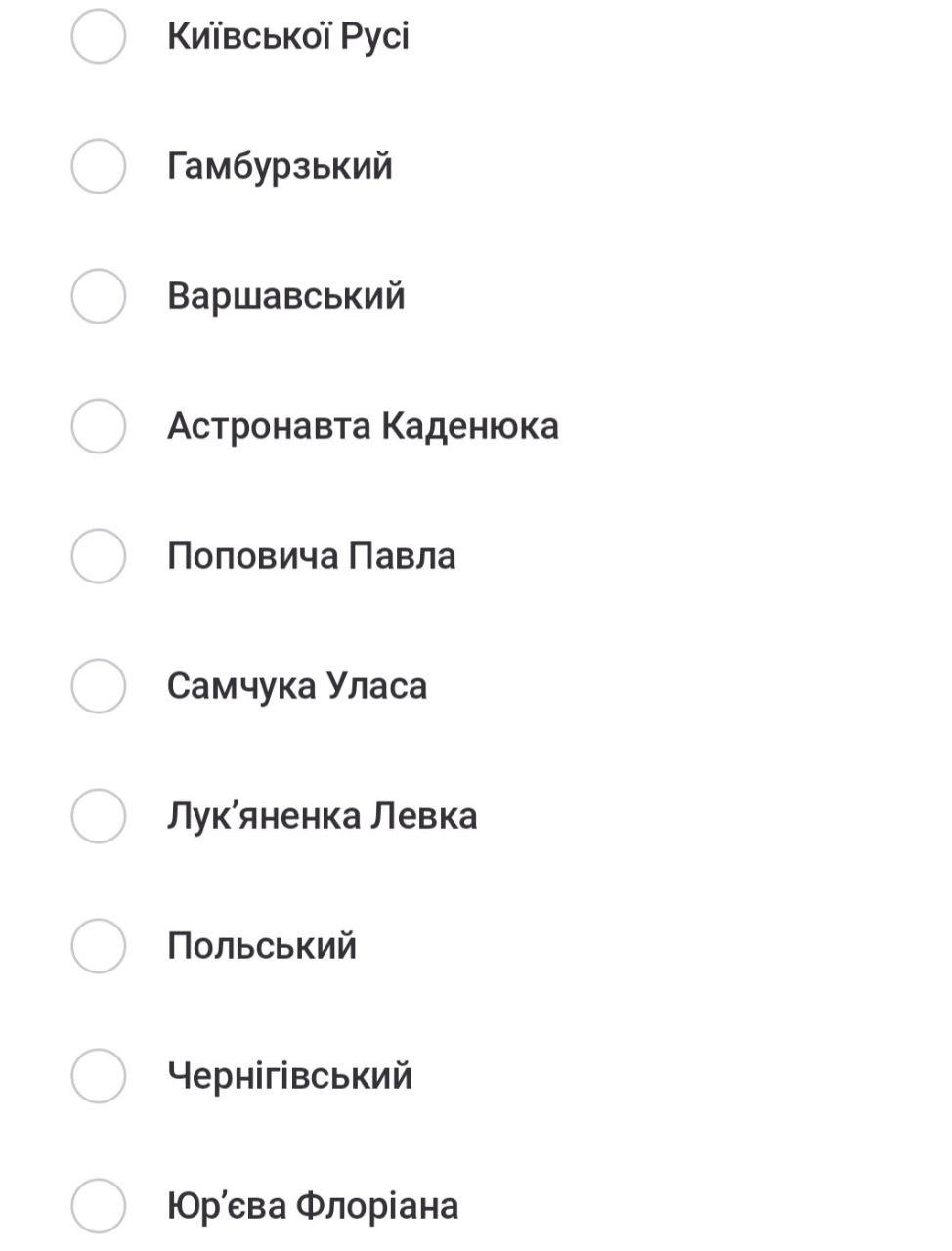 Всего можно выбирать из 36 вариантов. Среди них есть названия в честь украинских музыкантов и певцов - Кузьмы Скрябина, Владимира Ивасюка, географических названий - Троещинский, Польский, Флорентийский.