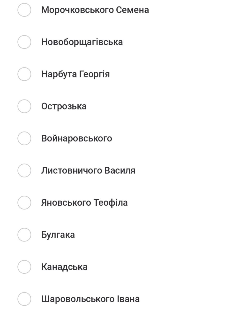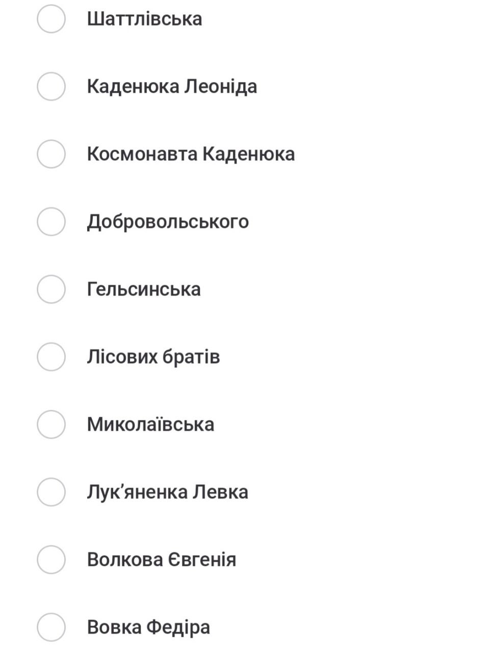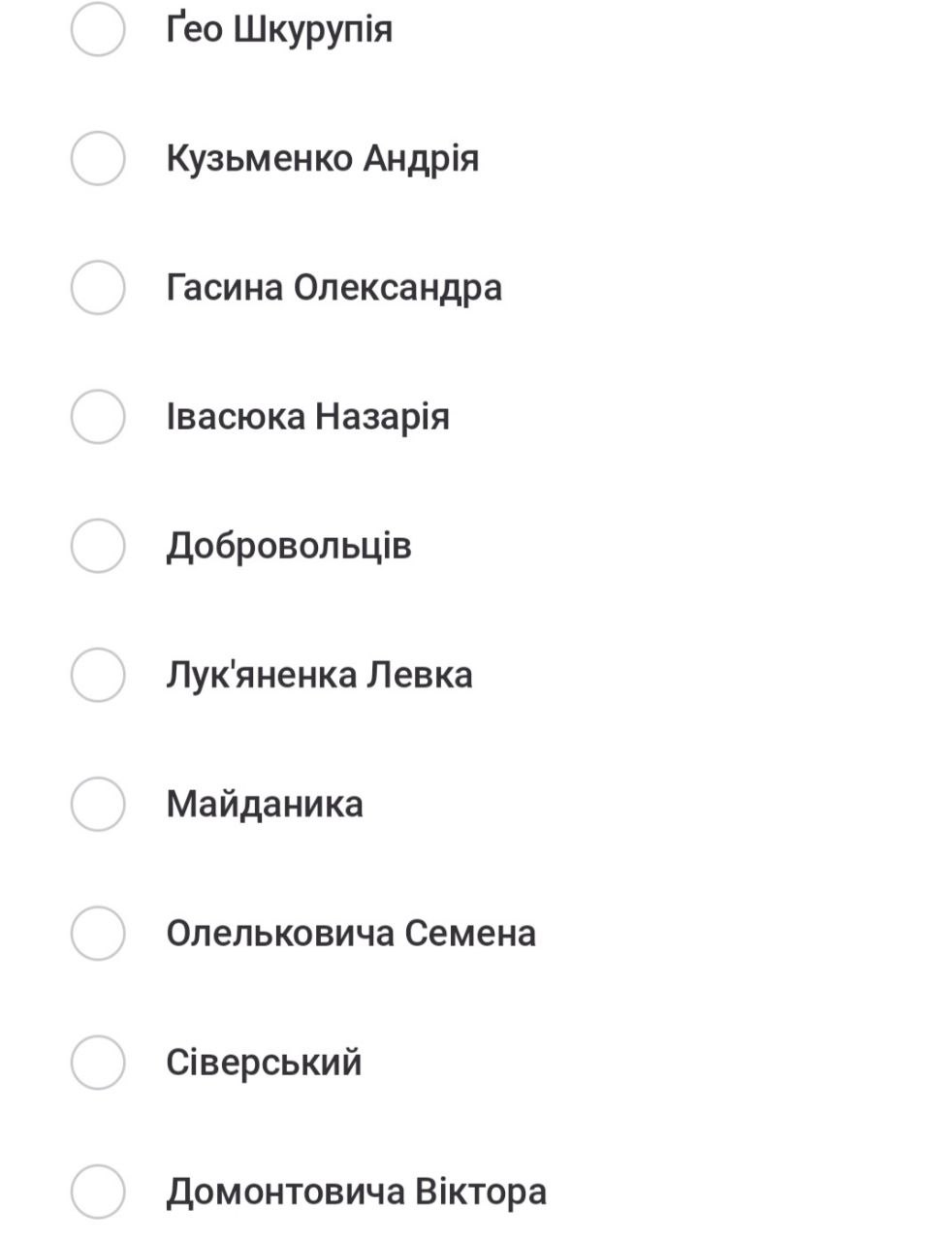 Всего можно выбирать из 36 вариантов. Среди них есть названия в честь украинских музыкантов и певцов - Кузьмы Скрябина, Владимира Ивасюка, географических названий - Троещинский, Польский, Флорентийский.