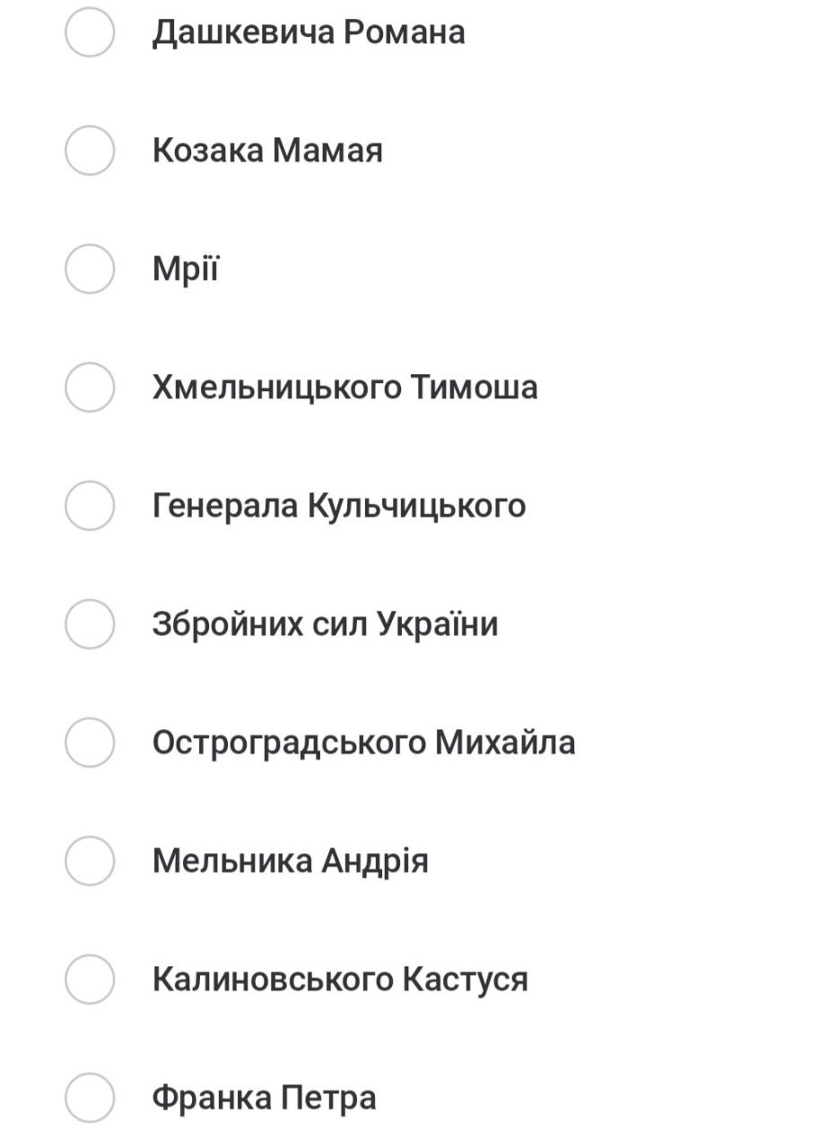 Часть вариантов в опросе рекомендована экспертами (Украинского института национальной памяти, Института истории Украины и других учреждений). Они находятся вверху списка.