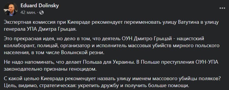 "Деятель ОУН Дмитро Грыцай - нацистский коллаборант, полицай, организатор и исполнитель массовых убийств мирного польского населения, в том числе Волынской резни", - пишет Долинский. По его мнению, такое предложение Киеврады может негативно повлиять в том числе на польско-украинские отношения.