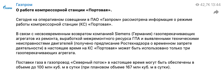 "В связи с несвоевременным возвратом компанией Siemens (Германия) газоперекачивающих агрегатов из ремонта, выработкой межремонтного ресурса ГПА и выявленными техническими неисправностями двигателей (получено предписание Ростехнадзора о временном запрете деятельности) в настоящее время на КС "Портовая" может быть использовано только три газоперекачивающих агрегата", - сообщила компания в своем телеграм-канале.