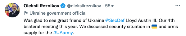 "Был рад видеть большого друга Украины Ллойда Остина III. Наша четвертая двусторонняя встреча в этом году. Мы обсудили ситуацию с безопасностью и поставку оружия для Украины", - пишет украинский министр.