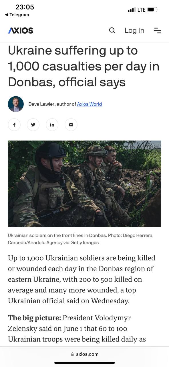 "Украинские потери составляют от 600 до 1000 (убитых и раненых) человек в день… Это представляет собой чрезвычайную потерю человеческих жизней и боеспособности защитников, втянутых в оборону восточного города Северодонецка, которая на этой неделе превратилась в проигрышную битву..." - говорилось в материале издания.