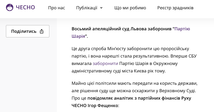 Восьмой апелляционный суд Львова запретил очередную партию по обвинению в "пророссийскости". Сегодня было объявлено решение о запрете "Партии Шария".