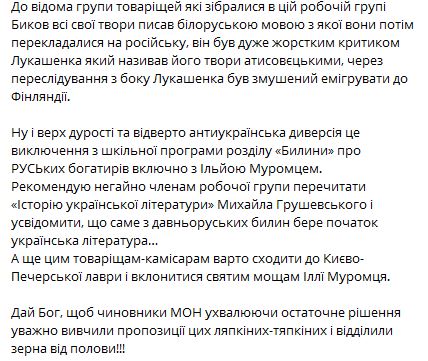 А еще этим товарищам-комиссарам следует сходить в Киево-Печерскую лавру и поклониться святым мощам Ильи Муромца. Дай Бог, чтобы чиновники МОН, принимая окончательное решение, внимательно изучили предложения этих ляпкиных-тяпкиных и отделили зерна от мякины!!!" - написал экс-нардеп.