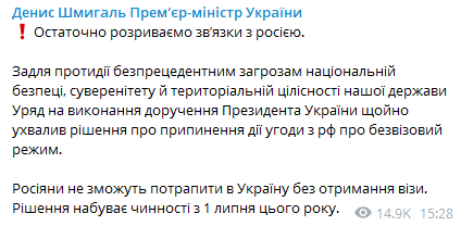 "Окончательно разрываем связи с Россией. Для противодействия беспрецедентным угрозам национальной безопасности, суверенитета и территориальной целостности нашего государства Правительство во исполнение поручения президента Украины только приняло решение о прекращении действия соглашения с РФ о безвизовом режиме", - заявил премьер.