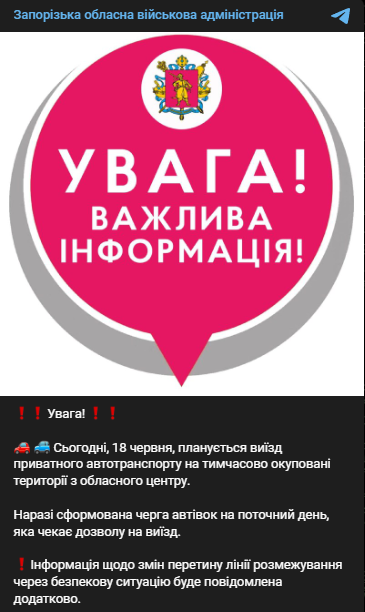 "Сегодня, 18 июня, планируется выезд частного автотранспорта на временно оккупированные территории из областного центра", – говорится в заявлении.