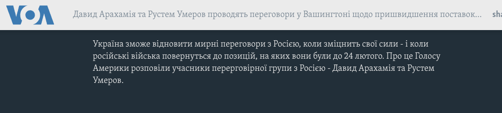 Об этом заявил глава переговорной группы с украинской стороны Давид Арахамия в комментарии "Голосу Америки".