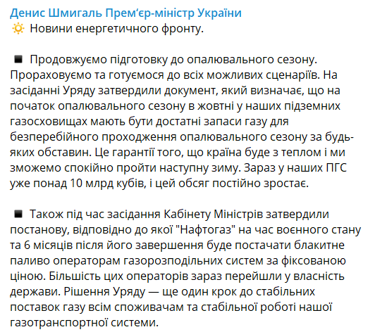 "На заседании правительства утвердили документ, определяющий, что к началу отопительного сезона в октябре в наших подземных газохранилищах должны быть достаточные запасы газа для бесперебойного прохождения отопительного сезона при любых обстоятельствах. Это гарантии того, что страна будет с теплом, и мы сможем спокойно пройти следующую зиму. Сейчас в наших ПХГ уже более 10 млрд кубов, и этот объем постоянно растет", - говорится в сообщении премьера.