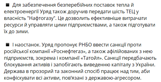Кроме того, для обеспечения бесперебойных поставок тепла и электроэнергии правительство также поручило передать шесть ТЭЦ в собственность "Нафтогаза". Это позволит более эффективно тратить ресурсы и управлять этими предприятиями, а также подготовить их к зиме.