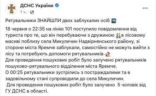 Пять местных спасателей ГосЧС нашли их уже в 00:25 и вывели в село Микуличин.