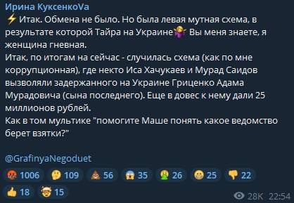 "Итак, по итогам на сейчас - случилась схема (как по мне коррупционная), где Иса Хачукаев и Мурад Саидов вызволяли задержанного в Украине Гриценко Адама Мурадовича (сына последнего). Еще в довес к нему дали 25 миллионов рублей", - пишет она.