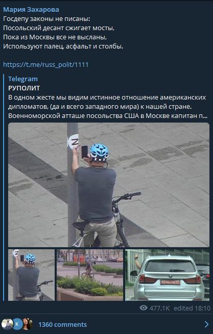 Военно-морской атташе посольства США в Москве Дэйл Сэмуэл, совершая велопрогулку по российской столице, остановился у столба с буквой "Z", и сделал фото, на котором показывает символу вторжения в Украину средний палец.