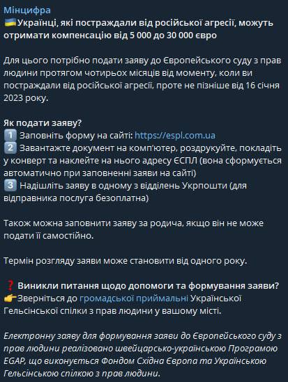 Украинцев, которые пострадали от войны, Минцифры Украины призывает обращаться в ЕСПЧ. По заявлению министерства люди смогут рассчитывать на компенсацию от ЕСПЧ в 5-30 тысяч долларов.
