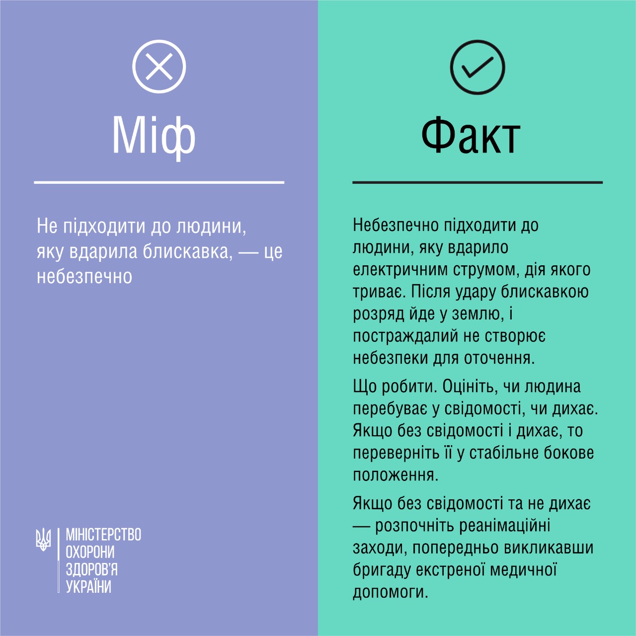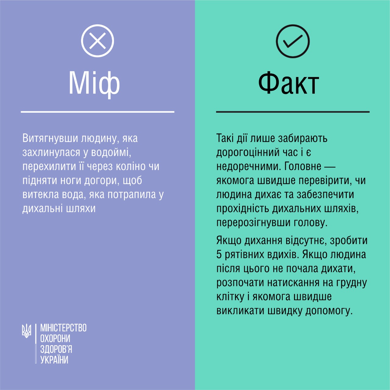 Министерство здравоохранения Украины продолжает развенчивать мифы о домедицинской помощи и публикует инфографику с основными ошибками, которые люди допускают при оказании помощи человеку, который потерял сознание, захлебнулся в воде или пострадал от удара молнии.