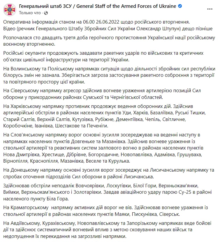 7.25 Сводка украинского Генштаба на утро 26 июня.