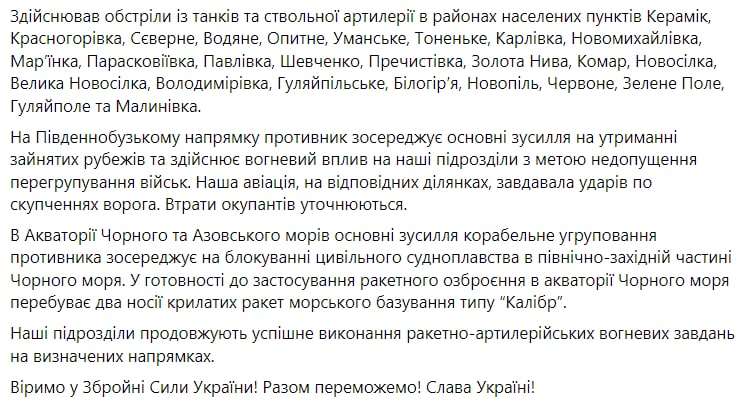 Также идут обстрелы по всей линии фронта. В Черном море насчитали два носителя ракет "Калибр".