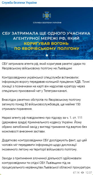 Сотрудники СБУ задержали агента РФ, который корректировал ракетные удары по Яворовскому военному полигону на Львовщине.