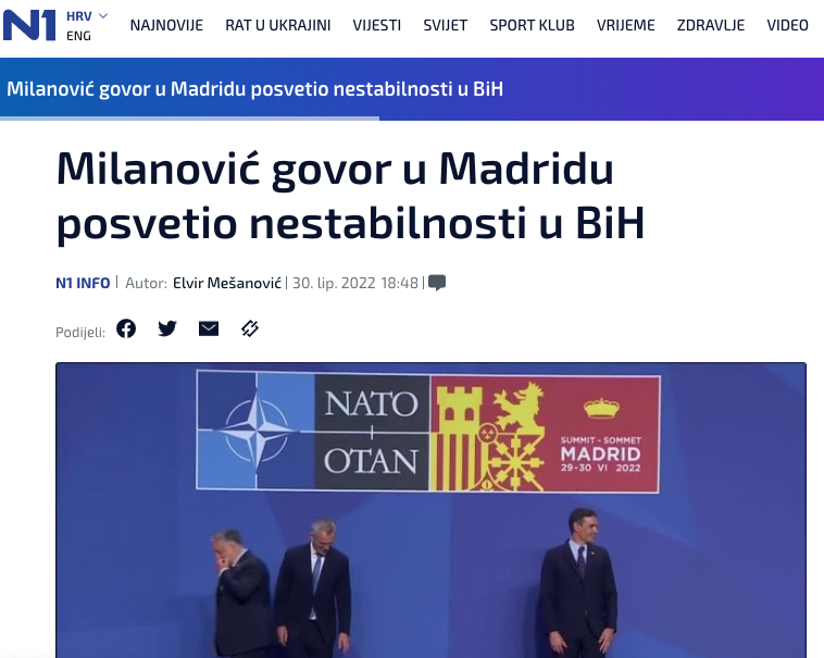Он отмечает, что президент Миланович в своей речи на саммите НАТО ни сказал ни слова против членства Финляндии и Швеции, а всю речь посвятил нестабильности в Боснии и Герцеговине и угрозе для хорватов там.