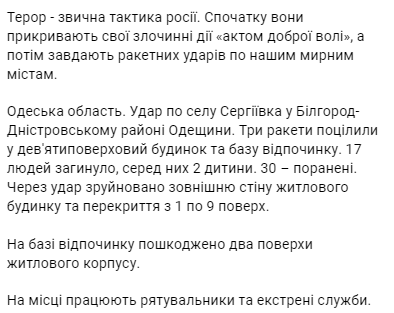 На данный момент известно о 17 погибших и 31 раненном в результате ракетного удара. Есть тяжело раненные, они в больнице. В оперативном командовании "Юг" сообщили, что удар по Одесской области нанесли самолеты Ту-22 с Черного моря. Всего по региону войска РФ выпустили три ракеты.